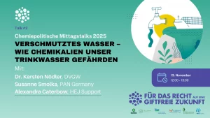 PFAS belasten zunehmend unsere Gewässer – besonders die Industriechemikalie Trifluoressigsäure (TFA). Sie ist hochmobil, extrem beständig und kaum aus dem Wasser entfernbar. Im zweiten chemiepolitischen Mittagstalk 2025 zeigten Alexandra Caterbow (HejSupport), Dr. Karsten Nödler (DVGW) und Susanne Smolka (PAN Germany), wie vielfältig die Eintragsquellen sind, welche Risiken für Gesundheit und Umwelt bestehen und warum ein vorsorgender Schutz an der Quelle entscheidend ist.