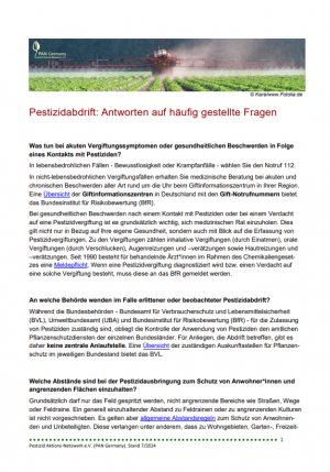 Immer wieder melden sich betroffene Menschen bei PAN Germany und berichten über gesundheitliche Beeinträchtigungen, über Schäden an Wild- oder Gartenpflanzen und über das Gefühl, der Pestizidabdrift hilflos ausgeliefert zu sein. Zur Beantwortung häufig gestellter Fragen und als Hilfestellung hat PAN Germany wichtige Informationen zu Abdrift in diesem Dokument zusammengetragen.